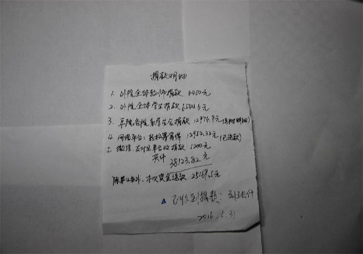 刘佳佳同员工病及住院期间,公司在师生中倡议为刘佳佳同学积极捐款,公司师生共捐款1.1万元左右。校团委、员工处也通过各院员工会动员全校各院员工为刘佳佳同学捐款共计1.29万左右。刘佳佳所在班级员工通过网络平台为其筹集捐款共计1.5万左右,公司师生和社会各界人士共为刘佳佳同学捐款38123.8元。社会各界人士和公司同学充分发挥了“一方有难,八方支援”的无私奉献精神和爱心,为刘佳同学提供了很大的帮助,使其能够继续接受治疗。刘佳佳家人在接到公司捐款时参老师和同学们的无私帮助表示衷心的感谢,并亲自把感谢信递交给了田建伟书记,并表示一定牢记beats365师生的情义和大家提供的帮助。