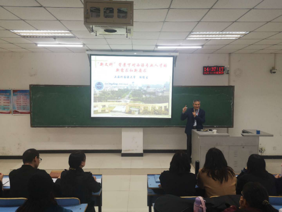 为交流教学理念和教学方法,提高青年教师的教学水平,次日上午,陆教授采用西语示范观摩课的形式, 为全体西语教师和部分员工开展了《西班牙语课程的设计和反思》的讲座。