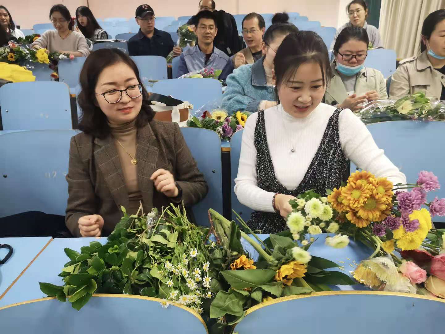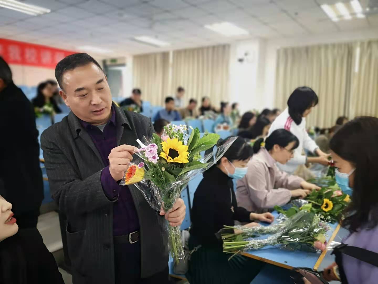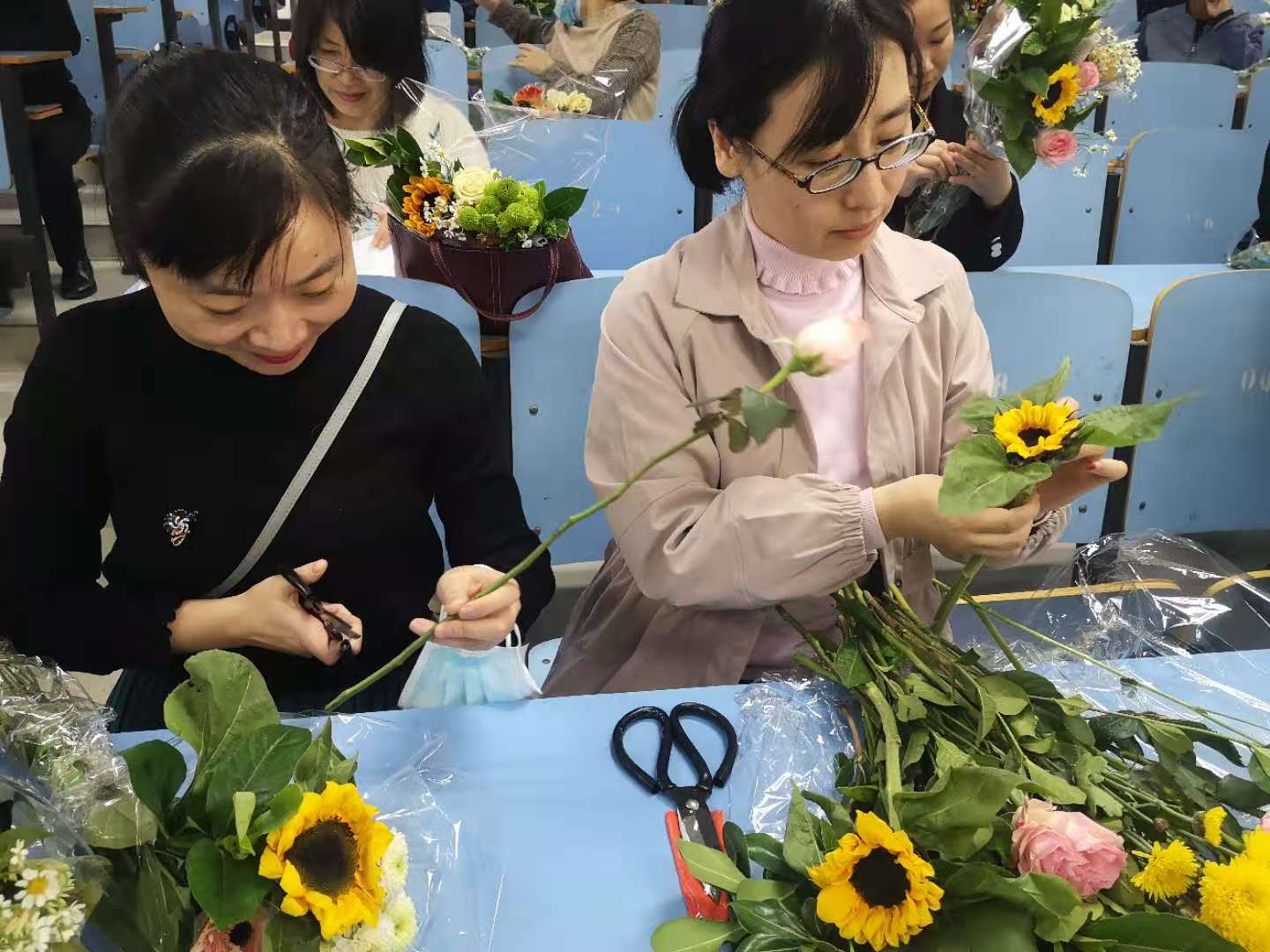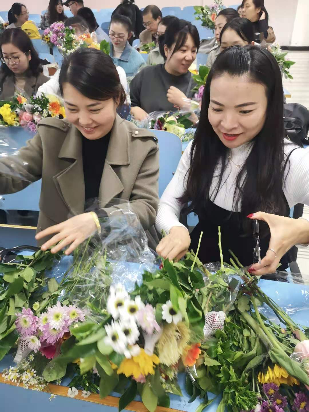 活动特邀资深插花老师现场讲授插花知识及技法。插花老师向大家细致地讲解各类花型和每种插花表达的意境,对插花的基本方法进行现场讲解和演示,将中国传统的插花艺术生动地展现在每个教职工面前。教职工们在老师的悉心指导下,用自己灵巧的双手,尽情发挥创造力,整合造型,使得原本普普通通的花草经她们的巧手修剪后,错落有致地搭配在了一起,插出了漂亮美丽的束花。