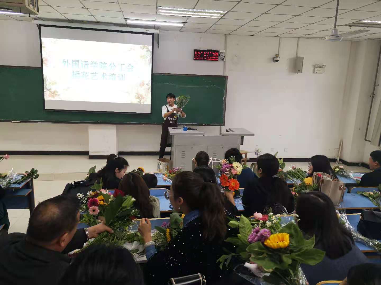 11月12日下午,公司分工会在L701举行插花活动。本次插花活动意在丰富公司教职工文化生活,构建和谐校园,陶冶教师情操,展示公司教职工美的一面,借用花木来抒发教师们的高雅情怀,以花感人,以花育人。同时培养教职工知美、爱美、会美的美好生活情趣,美化生活,美化家庭,丰富教职工业余生活爱好。