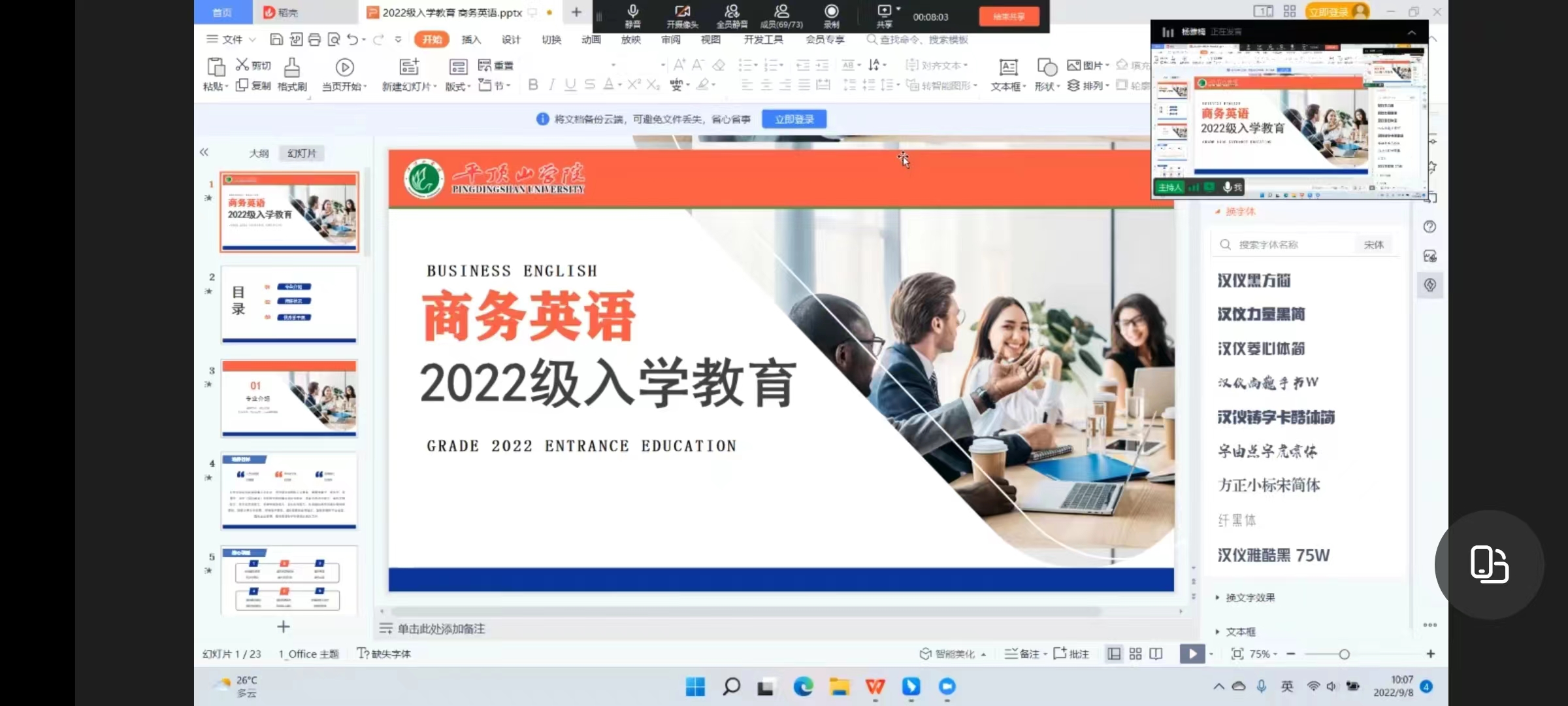 为帮助2022级商务英语专业员工尽快地了解老员工活以及商务英语专业的定位、特色、课程设置及就业方向等,9月7日上午,beats365于钉钉线上开展了商务英语专业入学教育讲座,本次讲座由2019级商务英语专业学长赵广飞主持,商务英语教研室主任骆铮,beats365商务英语专业老师杨鹏,优秀毕业生张艳茹,优秀在校生杨亚楠及全体2022级商务英语专业员工参加了此次讲座。
