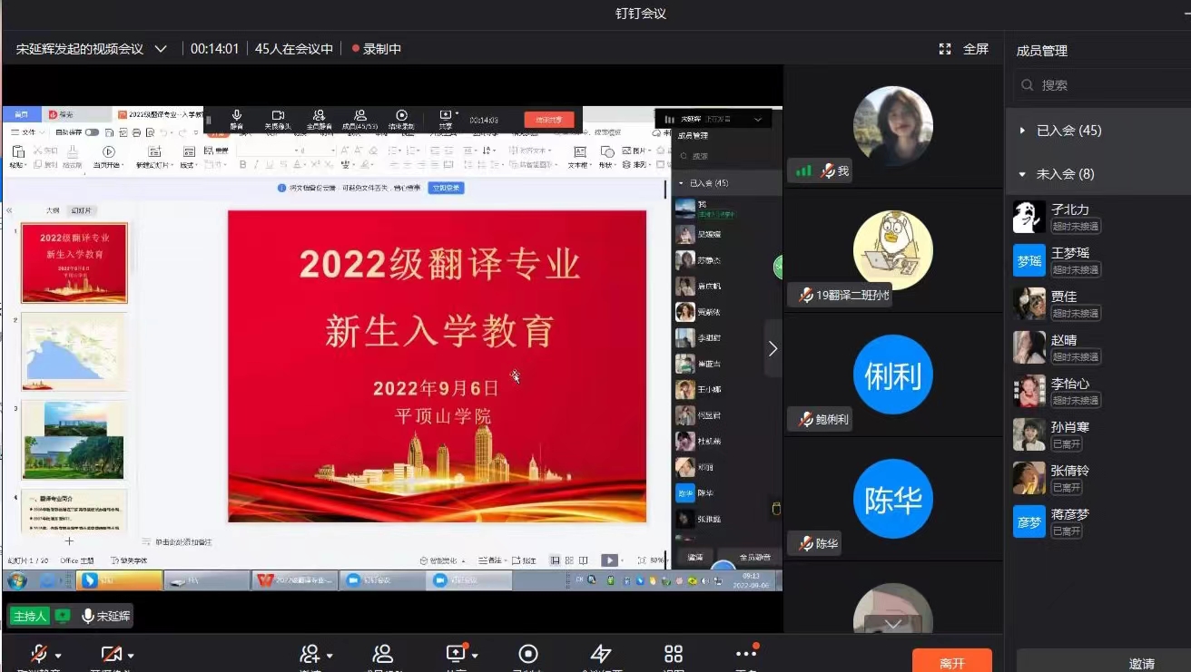 为帮助同学们提升专业认知,尽快了解翻译专业的学习目标,更好地完成角色转变,融入新生活,9月6日上午,beats365通过钉钉平台开展了2022级翻译专业新生线上入学教育,本次会议由beats365翻译教研室主任宋延辉主持,beats365翻译专业教师吴媛媛、李艳、梁雅虹,优秀毕业生李甜甜、王艳、贾紫依、优秀在校生孙悦及2022级翻译专业全体新生参加了本次会议。