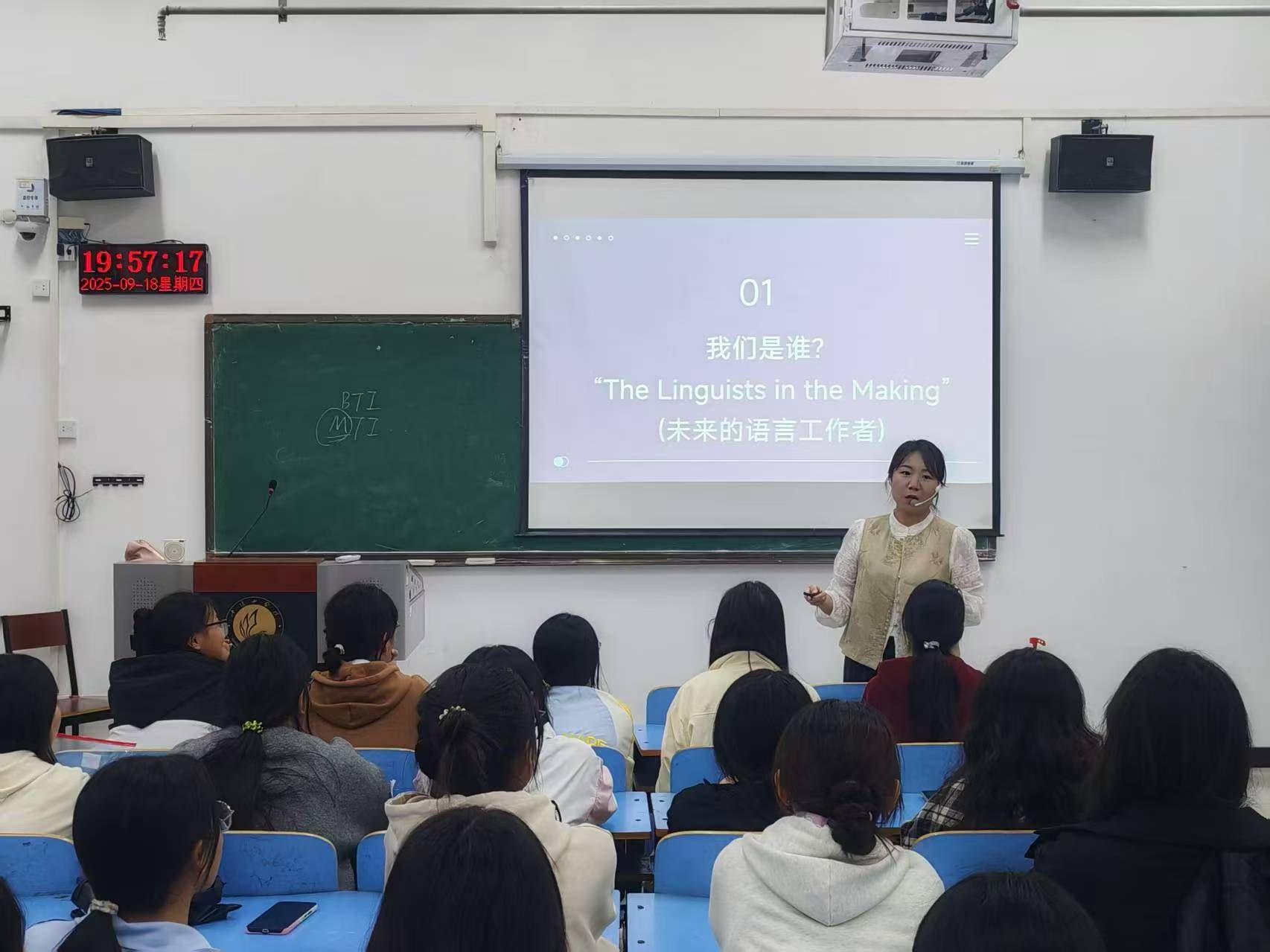 首先,赵丽对同学们的到来表示热烈欢迎,并邀请了几位专业教师与同学们见面。随后,梁雅虹简要介绍了翻译专业的培养目标和核心能力要求,并结合自身的学习与工作经历,向同学们分享了自己在专业学习上的体会与收获。接着,陈华围绕翻译专业的学习内容、学习方法以及未来发展方向进行了系统的介绍,通过梳理课程体系与能力要求,帮助同学们建立对专业学习的整体认知。介绍结束后,赵丽邀请了两位优秀毕业生代表通过提前录制视频和在线直播的方式,向同学们展示了自己在大学期间的学习生活与成长历程,分享了她们在翻译专业学习过程中的经验与感悟。优秀毕业生的生动讲述,激发了同学们对老员工活的向往与动力。最后,赵丽鼓励同学们以积极的态度迎接老员工活,明确目标,脚踏实地,在翻译专业的学习道路上不断前行。