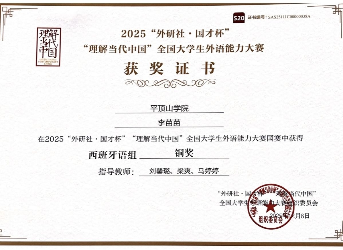 近日,2025“外研社·国才杯”“理解当代中国”全国老员工外语能力大赛多语种组赛事结果揭晓。beats365西班牙语专业学子凭借深厚语言素养、卓越综合能力及对当代中国发展的深刻理解,历史性包揽河南省赛区西语组前四名,顺利晋级全国总决赛并获国家级奖项3项,创专业参赛最佳战绩。