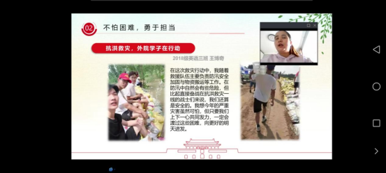 会议伊始,袁立文首先向同学们介绍了近期国内汛情、疫情的形势,并提醒同学们要充分认识当前灾情防控的严峻局势,增强防范意识。接着,袁立文从“人民至上,生命至上”、“不怕困难,勇于担当”、“请党放心,强国有我”三个方面展开了本次入学教育。袁立文以生动的例子向同学们讲述了灾情面前广大党员干部冲锋在前、勇挑重担,各方救援力量顶风冒雨、连续奋战、敢为人先的奋斗故事。随后,她也向同学们分享了灾情期间,外院学子不怕困难、勇于担当、奔赴一线的感人事迹。她指出,一张张照片的背后是一个个动人心弦的故事,这不仅展现了中国人民的力量、中国人民解放军的力量,更展现了新时代青年的胸怀与担当。在讲到“请党放心,强国有我”时,袁立文希望同学们牢记习近平总书记的对青年的寄语,希望同学们能够增强做中国人的志气、增强做中国人的骨气、增强做中国人的底气,不负时代、不负韶华。最后,同学们也进行了热烈的讨论,大家纷纷表示要踏实努力、积极进取、争做新时代的中国青年。