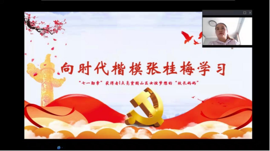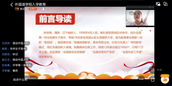 袁立文讲述了张桂梅坚守教育报国初心,牢记立德树人使命,扎根贫困地区40多年,立志用教育扶贫斩断贫困代际传递,倾力建成全国第一所全免费女子高中,让1600余名贫困山区女员工圆梦大学,托举起当地群众决战决胜脱贫攻坚的信心与希望的感人事迹。接着袁老师带领大家一起重温了张桂梅获得七一勋章时的发言,感受了张桂梅同志作为一名共产党员的崇高思想境界和高尚道德情操。最后,袁老师呼吁同学们要以国家需要为使命,胸怀全局,增强责任担当,自觉把个人理想追求融入国家和民族的事业中。