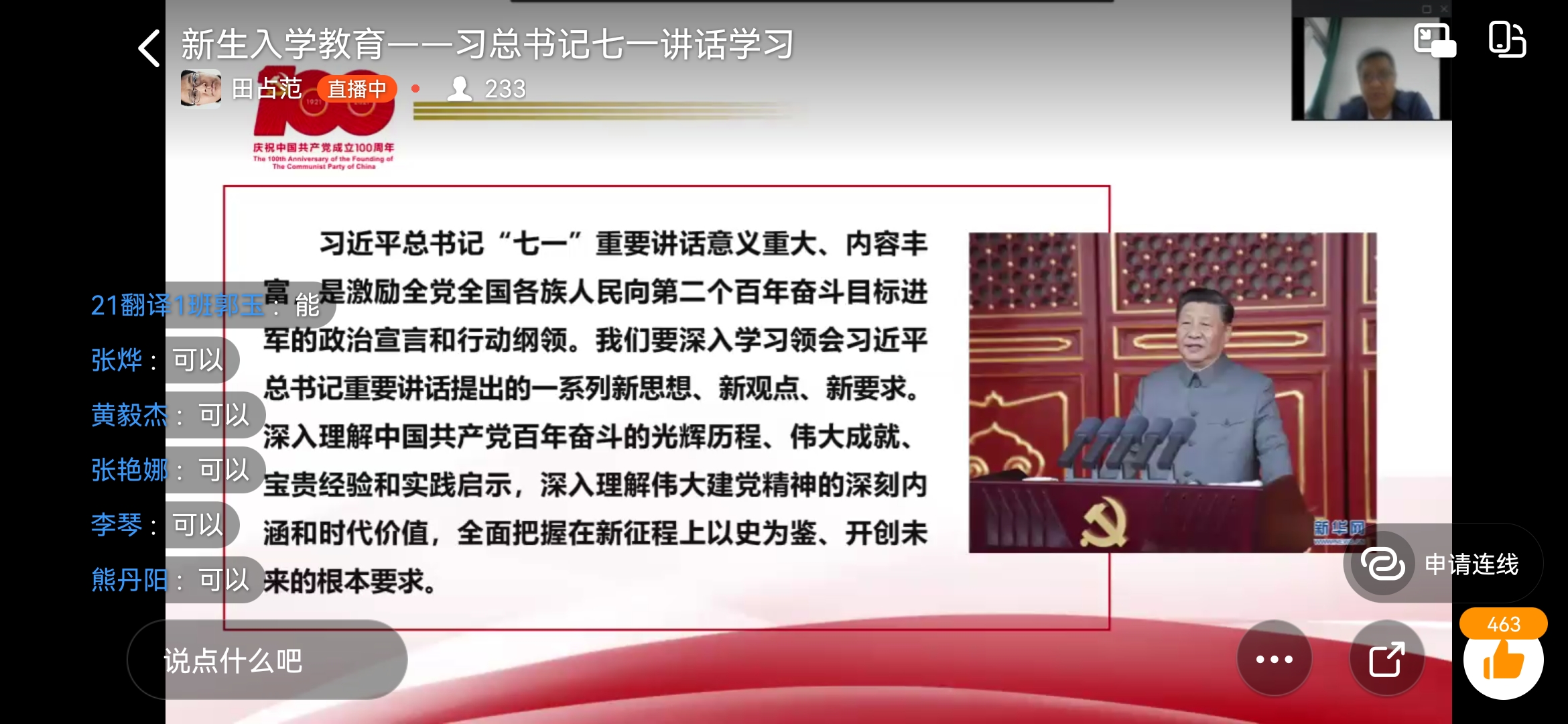 为深入学习贯彻习近平总书记“七一”重要讲话精神,9月28日上午,beats365通过钉钉直播开展以“风雨百年 砥柱人间 以史为鉴 开创未来”为主题的“七一”重要讲话精神专题宣讲会。本次会议由公司党委副书记田占范主讲,21级全体新生参加会议。