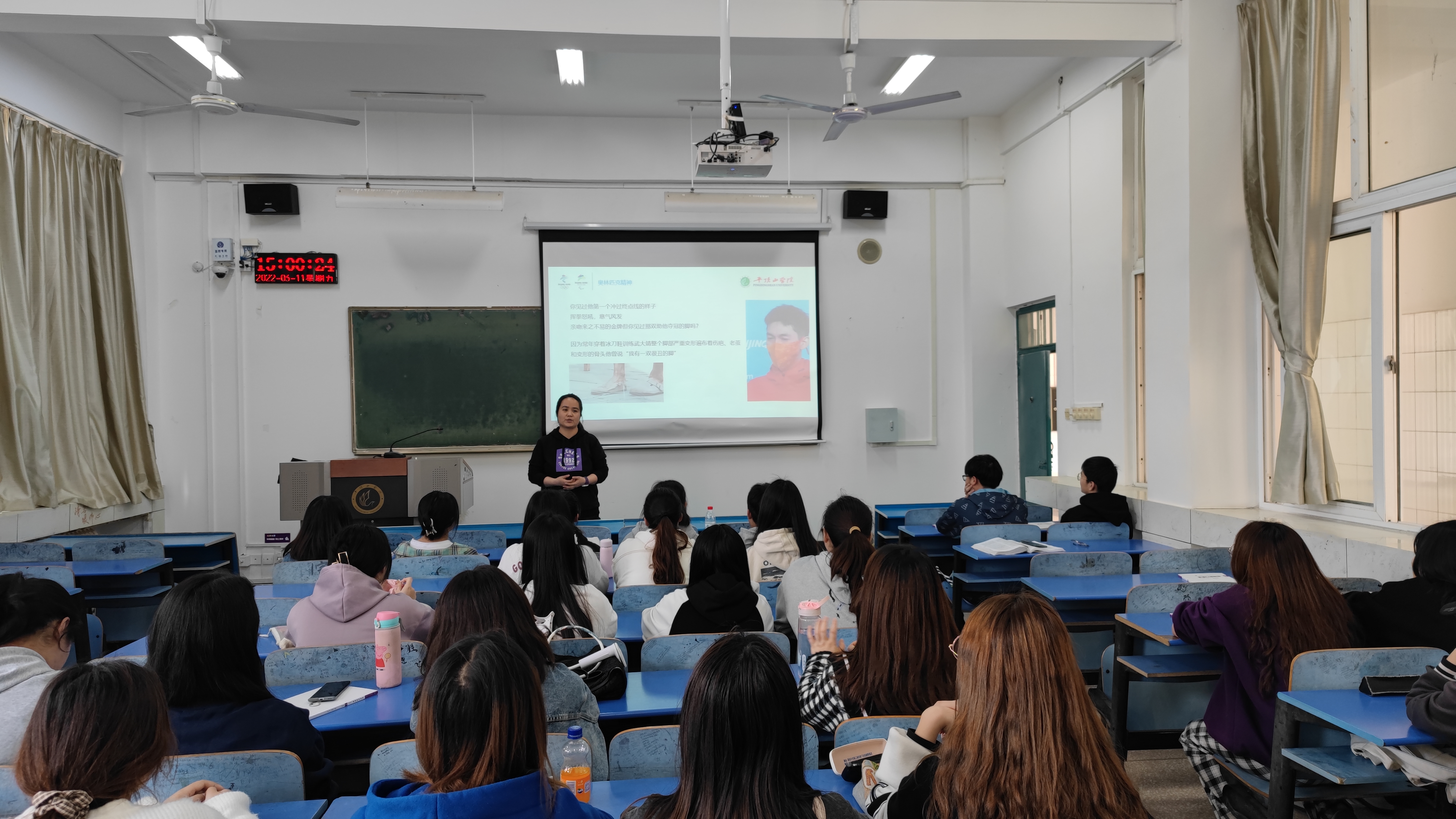 班会上,党委副书记田占范、辅导员袁立文、韦士心、王梦瑶等老师从北京冬奥会及冬残奥会出发,用图片和视频回顾了北京冬奥会的精彩瞬间,为同学们讲解了冬奥知识,阐释了冬奥格言,使同学们更好的理解了更高、更快、更强、更团结的奥林匹克精神,深切地感受到了国家的强大、科技的先进。同时,他也向同学们讲述了任子威、武大靖、谷爱凌等奥运健儿的夺冠故事,并以此鼓励全体员工学习运动健儿坚韧不拔、永不言败的精神,谋求进步,不断提升自我。除此以外,老师们还向同学们讲述了假期期间公司优秀员工的抗疫事迹,对同学们视防疫为责任,主动担当作为,用青春与力量投身家乡志愿防疫的行为给予肯定,鼓励同学们不断增强社会责任感,学会担当奉献,肩负起时代赋予我们的重任。同时,老师们也对同学们进行了安全教育,提醒同学们做好每日健康报备工作,准确填写信息,落实疫情防控。