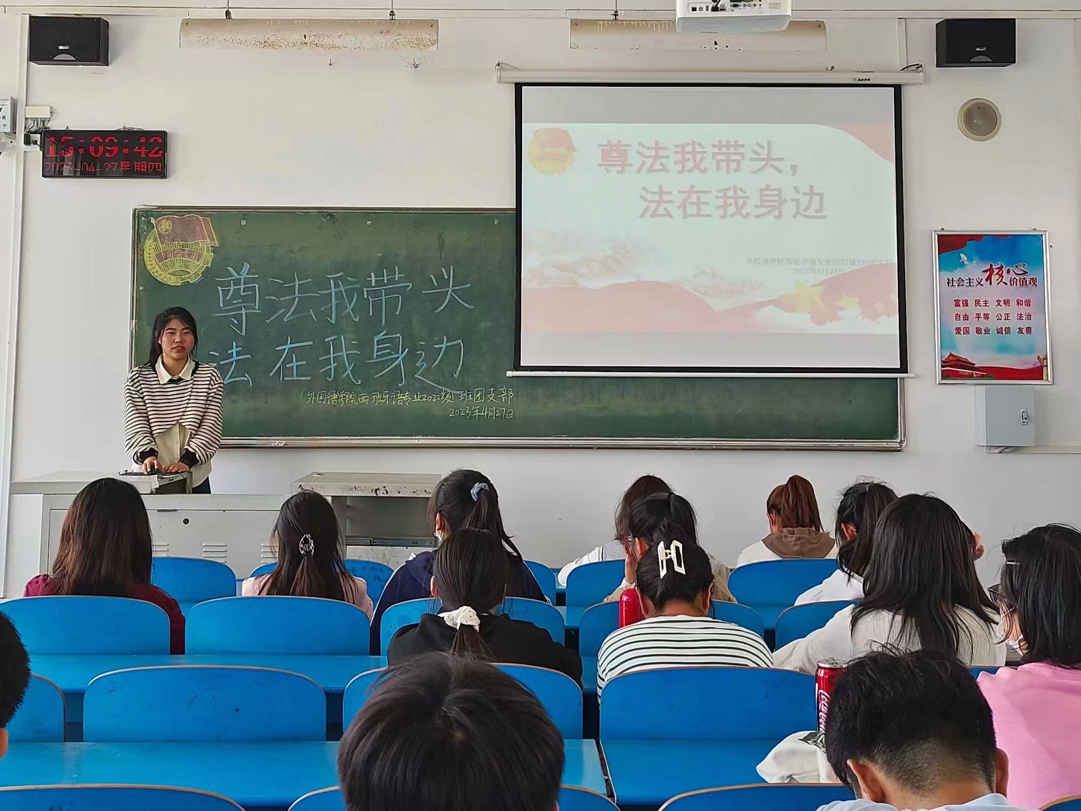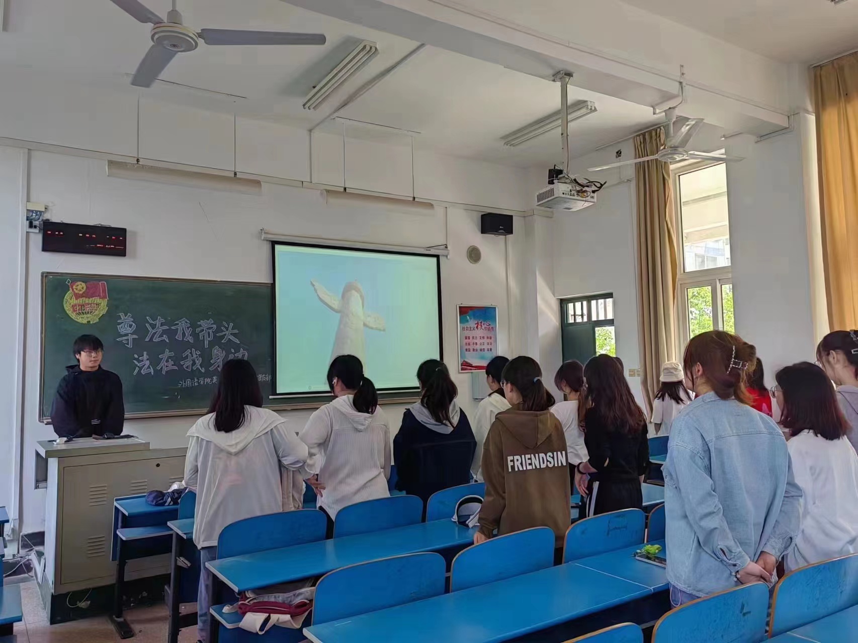 活动伊始,各班团支书带领同学们齐唱了中国共产主义青年团团歌,并引领同学们学习了党的二十大报告中有关依法治国的内容,帮助同学们坚定社会主义法治理念,完善社会主义法治知识,加强对法治社会战略部署的理解认知。接着,各班团支书组织同学们观看了《法律讲堂▪生活版》系列视频,视频中讲到,同学们要充分认识习近平法治思想的重大意义和深远影响,深刻领悟习近平法治思想的精神实质,并将习近平法治思想学深、务透、做实。随后,各班团支书鼓励同学们分享身边的法治小故事,并引导同学们从故事中探寻法律、学习法律、遵守法律。最后,各班团支书以问答的形式对《高等公司信息公开办法》进行知识宣讲,充分调动同学们学习法律知识的积极性,帮助同学们增强守法意识,鼓励同学们学会运用法律武器维护自己的合法权益。同学们纷纷表示,作为新时代青年要自觉增强法律意识,切实提升法治素养,做社会主义法治的自觉遵守者、坚定捍卫者,将法律知识与自己的生活实际相结合。