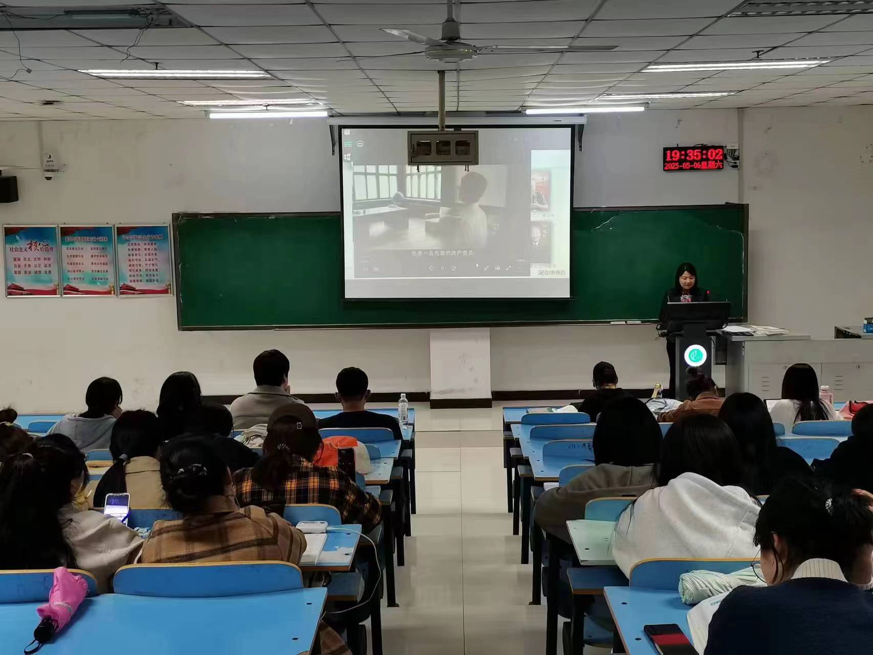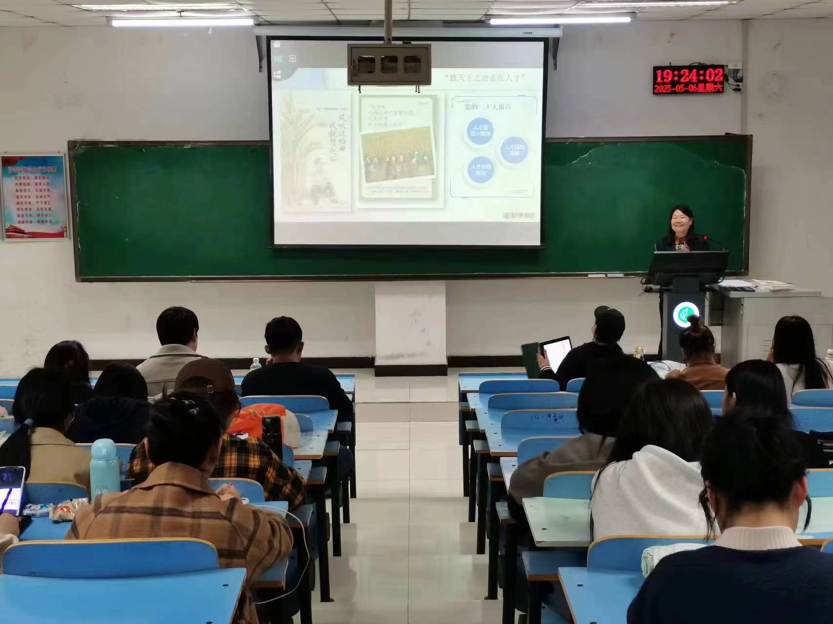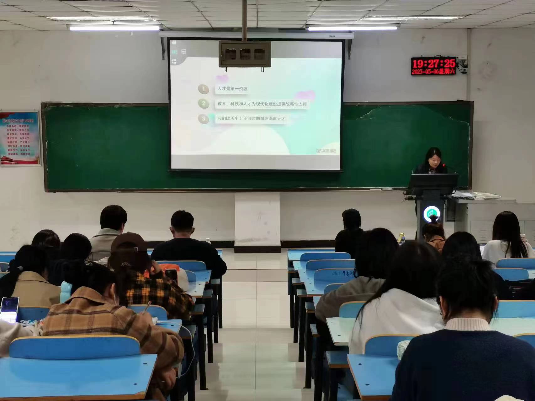 课程伊始,蒋领敏指出,要推进中国式现代化建设,必须培养造就现代化建设所需要的高素质人才,接着,她以员工专业与大时代背景为出发点,简要地分析了我国高等教育面临的机遇和挑战,勉励同学们要学好专业知识,提高自身能力,努力担当时代赋予的责任,为实现中国式现代化贡献力量。同时,她结合案例为同学们分析了人才强国战略的重要内容,从我国实施人才强国战略的现实考量、当前人才发展面临的新阶段以及我国“聚天下英才而用之”的政策措施等三个方面对人才强国战略进行了深度分析,她指出,科技创新已成为国家发展的重要支撑,而落实人才强国战略则是科技发展的关键。最后,蒋领敏通过问答的方式了解了同学们的学习生活与理想抱负,并鼓励同学们要努力提高自身综合素质和专业技术水平,将自身发展积极融入国家发展战略,因势而为,勇于担当,为实现中华民族伟大复兴的中国梦贡献青春力量。