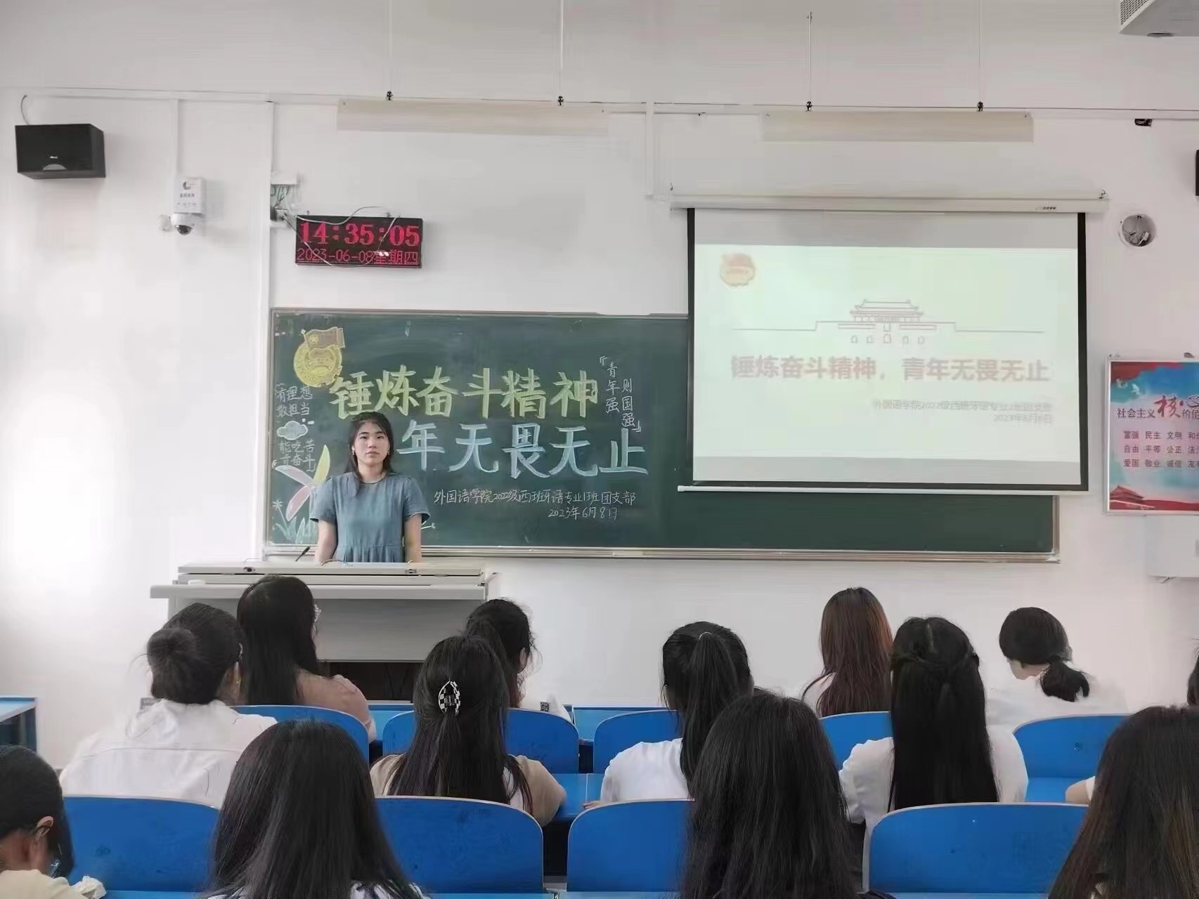 活动伊始,各支部团支书带领同学们齐唱了中国共产主义青年团团歌,并通过组织同学们观看有关重庆山火扑救和河南暴雨抗洪的相关视频,引出本次活动主题。各班团支书结合视频给大家讲解防灾救灾的安全知识,提醒同学们熟练掌握有关防汛工作的安全技能,树立防汛的安全意识。接着,各支部团支书带领大家学习了习近平总书记在全国劳动者和先进工作者表彰大会上的重要讲话,引导同学们以劳模为榜样,以劳模精神为引领,努力学习专业知识,用实际行动弘扬奋斗精神。最后,各支部团支书组织同学们开展了以“最美奋斗者”为主题的讨论活动,鼓励同学们分享自己心中最美奋斗者的故事。同学们纷纷表示,在今后的学习与生活中要向先进劳动工作者学习,保持初心,继续拼搏,为全面建设社会主义现代化国家、全面推进中华民族伟大复兴贡献青春力量。