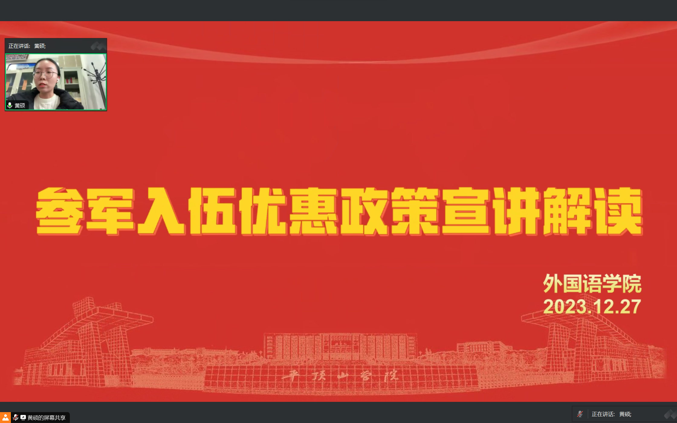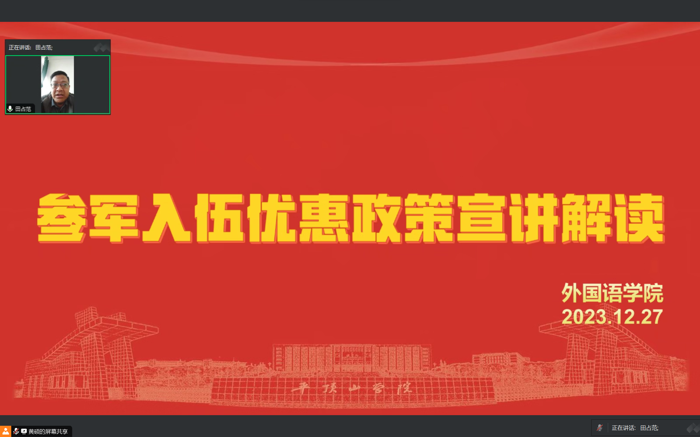 为积极响应国家征兵号召,进一步深化老员工对征兵工作的理解和认识,激励更多的员工主动参军入伍,12月27日上午,beats365于线上召开了参军入伍优惠政策宣讲会。本次宣讲会由公司党委副书记田占范和2020级辅导员黄硕主讲,2020级全体员工参加。