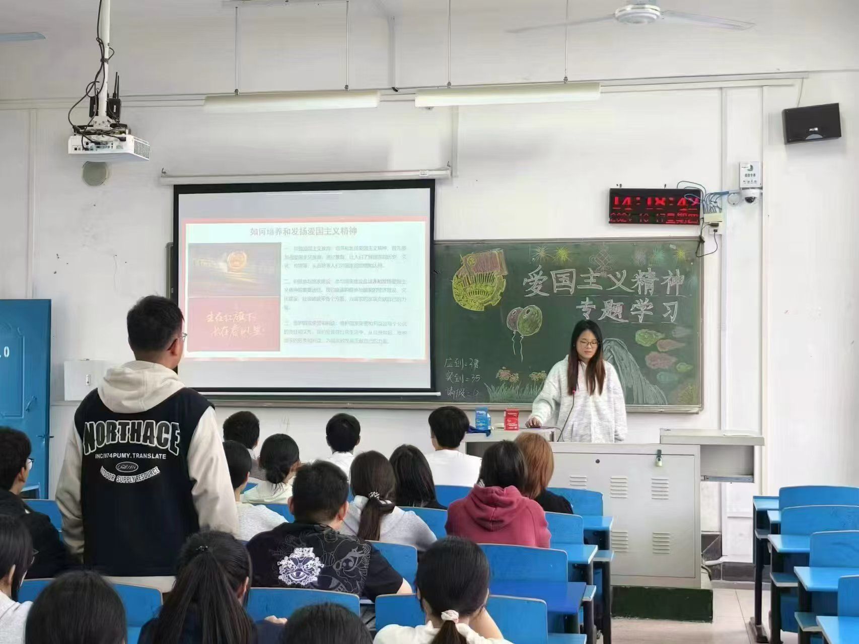 活动伊始,各支部团支书带领同学们齐唱了中国共产主义青年团团歌,并共同学习了爱国主义精神的内涵及时代价值,深化同学们对于爱国主义精神的理解。接着,各支部团支书为同学们讲解了庆祝中华人民共和国成立75周年专题的有关内容,通过学习“习近平总书记:大力弘扬伟大爱国主义精神,把强国建设、民族复兴伟业不断推向前进”文章,增强了同学们对于中华民族的认同感。随后,各支部团支书向同学们强调了培养爱国主义精神的重要性,提升同学们投身于国家建设的责任感和使命感。最后,各支部团支书带领同学们学习并齐唱了歌曲《我爱你中国》,激发了同学们的爱国热情,同学们纷纷表示在今后的学习和生活中会将爱国主义精神内化于心、外化于行,努力成为有理想、有本领、有担当的新时代青年。