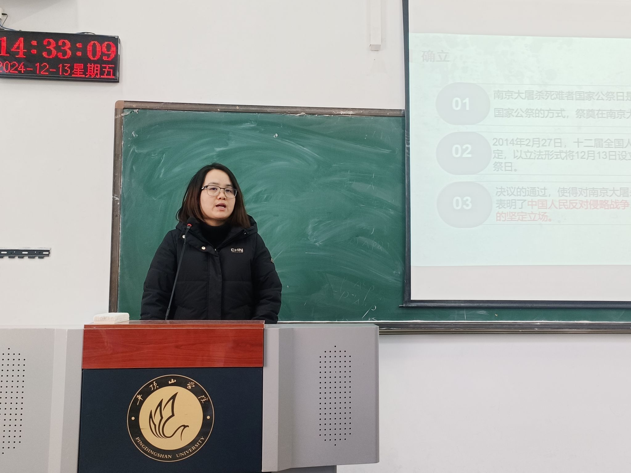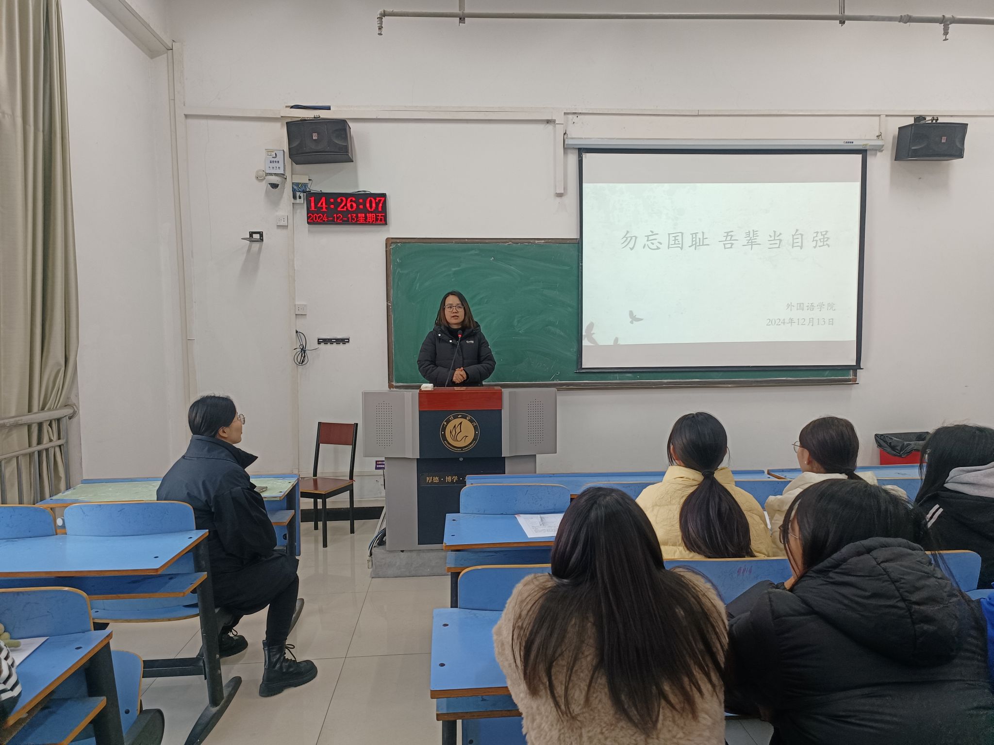袁立文首先组织同学们观看了南京大屠杀专题纪录片,向同学们展示了南京大屠杀的历史照片,让她们直观感受了那段惨痛的历史。随后她就青年“勿忘国耻,圆梦中华”这一话题让同学们展开讨论,同学们纷纷表示自己将铭记历史,不忘国耻,以更加饱满的热情投入到学习和生活中,为实现民族复兴而不懈努力。王梦瑶向同学们简述了南京大屠杀的历史背景以及国家公祭日的设立目的,引导同学们深刻理解历史真相,勿忘国耻,增强自身的历史使命感和责任感。