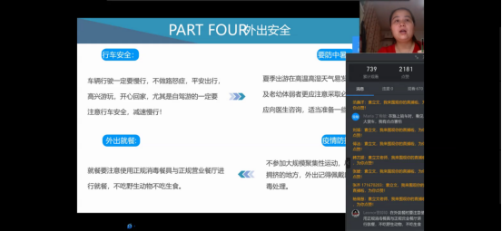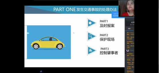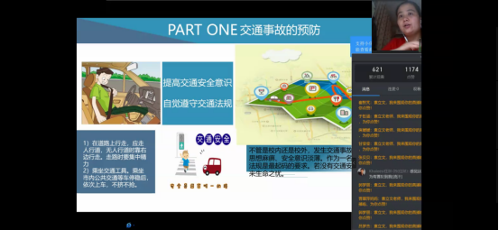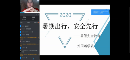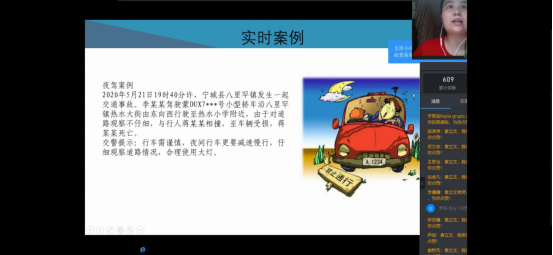 首先,袁立文老师对于同学们日常出行和暑期计划进行了线上调研,同学们积极回应。然后她围绕着出行安全带领员工学习交通安全、驾驶安全、旅游安全、外出安全等教育内容,并且针对不同安全类型提出了相应的预防与解决办法,其中袁立文老师提到对于交通事故的预防中,同学们应该提高交通安全意识,自觉遵守交通法规。在发生交通事故时,同学们要及时报案,保护现场并且控制好肇事者。同时,袁立文老师还就同学们机动车和非机动车的驾驶安全注意事项详细讲解,嘱咐同学们一定要系好安全带,骑行戴头盔,遵守交通法规。紧接着袁立文老师通过北京新发地疫情情况和浙江温岭槽罐车爆炸事故讲述了出行的安全隐患和常识,让同学们认识到在日常生活中防患于未然的重要性和生命的脆弱与可贵,进一步的提高了同学们的安全防控意识,并对同学们如何做好外出安全和疫情防控进行了安排。最后,袁立文老师对安全知识进行了总结并建议同学们时刻绷紧安全这根弦,做好疫情防控下的安全出行。