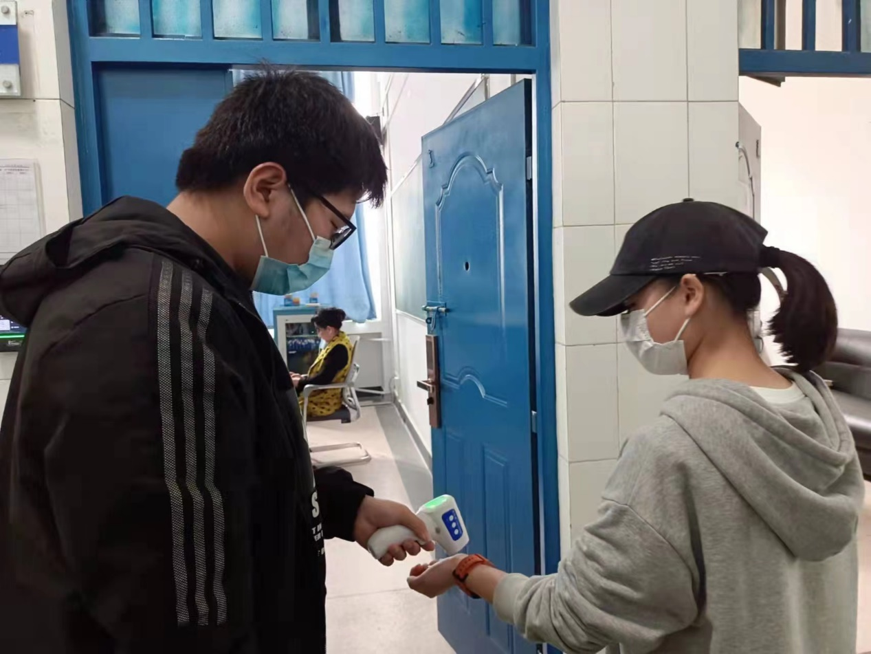 为切实做好员工进教室前体温测量工作,同时保障志愿员工的上课时间,公司科学安排体温测量人员。值班教师和志愿员工在员工进教室前,使用额温枪为进出的员工们测量体温并填写记录表。整个测量流程从测量到离场,组织科学、保障有力、防护到位,全体人员积极配合、秩序井然。