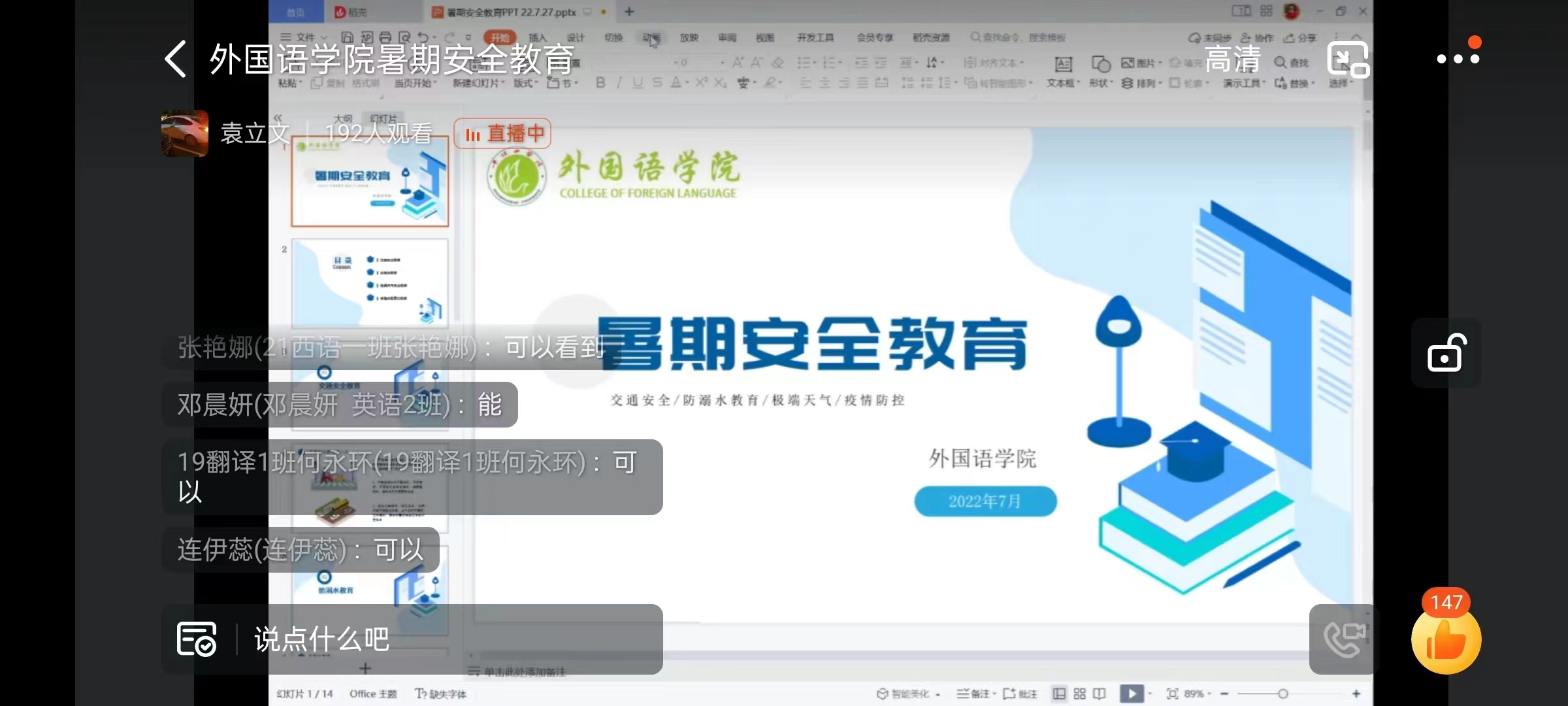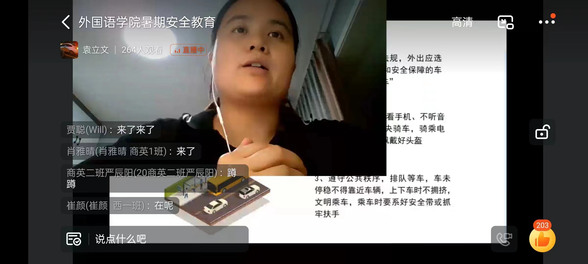 班会伊始,袁立文从交通安全讲起,她提到,暑假期间,老员工探亲访友、进行长途旅行等外出活动大幅增多。当前交通环境日益复杂、行人走路看手机、随意横穿马路等行为带来的悲剧仍不时发生,因此,她呼吁同学们要遵守交通法规、文明出行。接着,她针对近期频发的暴雨、高温等气候现象,嘱咐同学们要注意极端天气,面对高温,不要随意外出游泳,珍爱生命,谨防溺水,面对暴雨等其他极端天气情况,多掌握一些自救知识,以便在遇到灾害时最大程度地保证人身安全。随后,她再次强调疫情防控的重要性,并叮嘱同学们跨省出游一定要提前报备,同时做好防护措施,时刻保持警惕,保证人身安全。最后,她希望同学们能时刻将“安全无小事,生命重泰山”这一原则牢记心间,无论在哪里都要重视安全问题。同时,她建议同学们在家中能够多和家长沟通交流,在力所能及的情况下多帮父母做一些家务,合理分配自己的时间,做好暑期规划。
