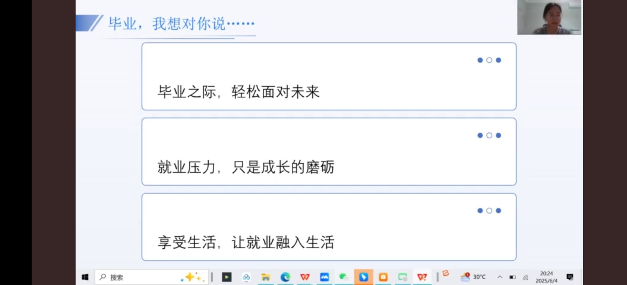 为切实关注毕业生的心理健康与成长需求,帮助2025届毕业生以积极、阳光、自信的心态应对毕业季的挑战与转变,顺利迈入人生新征程,6月4日晚上,公司组织召开了毕业生心理疏导大会。本次大会由21级辅导员韦士心主持,2021级全体员工参加。