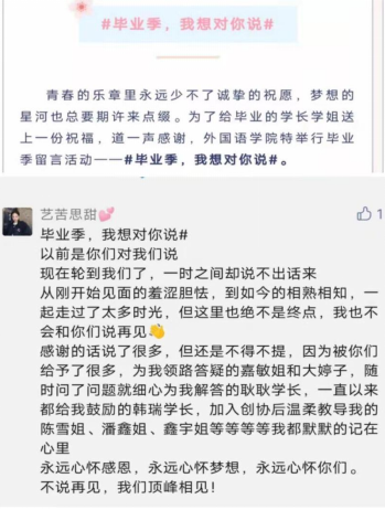组织在校生开展“毕业季,我想对你说”留言征集活动。在校生们积极参与了此次留言征集活动,表达了对毕业学长学姐最深切美好的祝福。虽然无法当面诉说再见,但通过这次活动同学们将最真挚的祝福送给继续奔赴人生道路的毕业生们,希望他们在新的征程上越来越好。