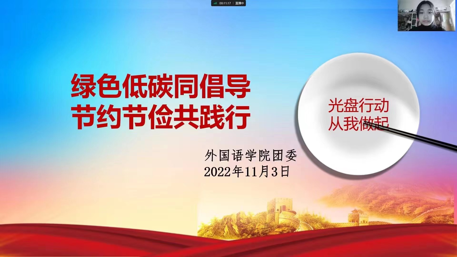 活动伊始,各班团支书带领全体同学齐唱中国共产主义青年团团歌,并和同学们共同观看了共青团中央社会联络部邀请专家进行的绿色低碳生活的线上课。本次公开课向同学们宣传了绿色低碳生活的理念,提倡了节俭节约的生活方式,鼓励同学们坚持节约资源,低碳生活。接着,各班团支书向同学们强调了光盘行动的必要性,呼吁同学们将“光盘行动”进行到底,鼓励同学们争做新时代文明餐桌行动的推广者和监督者,争做绿色低碳生活的倡导者和实践者。最后,各班团支书带领同学们阅读了关于“践行绿色低碳,做好节约粮食”的倡议书,全体同学积极响应,签署倡议书,纷纷表示要牢记绿色节约的生活观念,并在今后的生活中将其付诸实践。