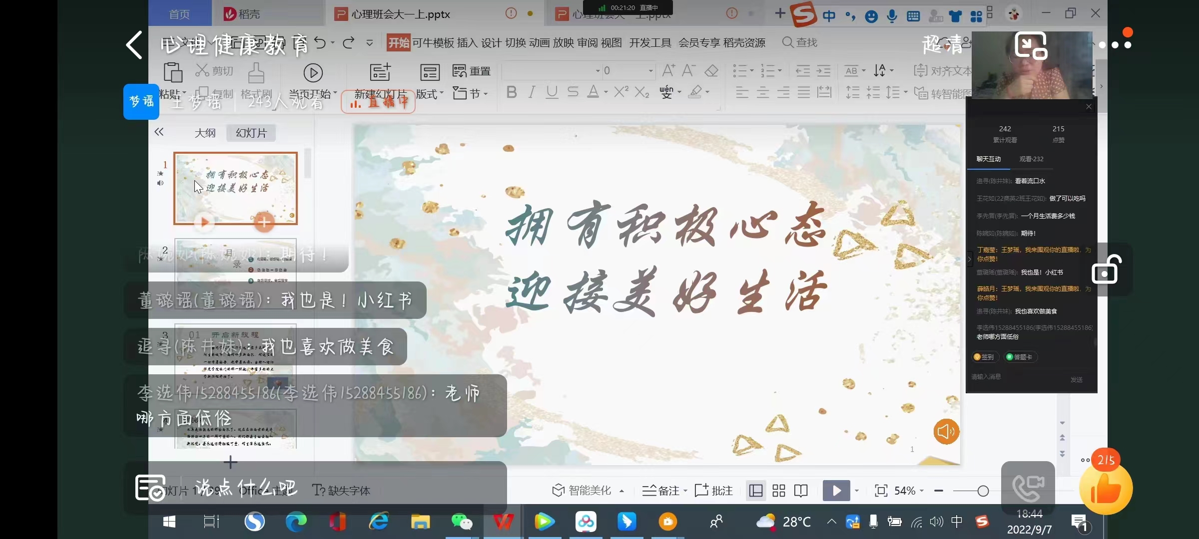 为了帮助新生尽快适应老员工活,疏解成长压力,提高新生的心理素质,9月7日下午,beats365面向2022级新生开展了以“拥有积极心态,迎接美好生活”为主题的心理健康教育讲座。本次讲座由beats365辅导员王梦瑶主讲,beats365全体2022级员工参加。