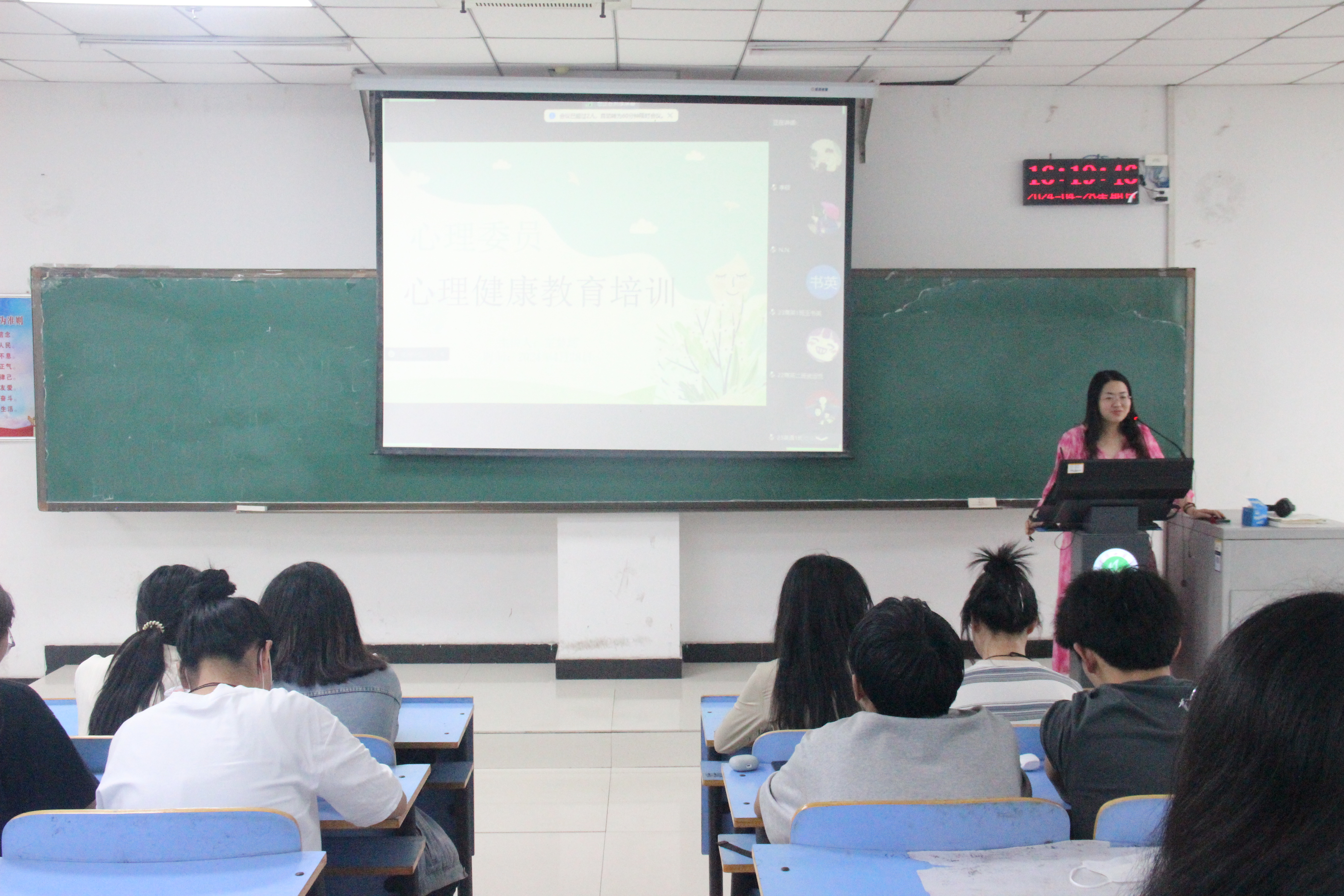 培训会伊始,王梦瑶从心理健康的定义、标准和特征三个方面展开向同学们进行了详细的讲解。在心理健康的标准方面,王梦瑶讲到,心理健康是指一个人在身体、心理和社会适应能力等各方面都处于良好状态,帮助同学们对心理健康有了更加清晰的认识。接着,王梦瑶结合老员工当前的心理健康状况讲到,当下部分老员工很容易为焦虑、抑郁等负面情绪所困扰,同学们在日常生活中要多参与集体活动、多运动、多看书,培养积极的心态,及时排解不良情绪。最后,王梦瑶鼓励各班心理委员及宿舍信息员明确自身职责,积极向同学们宣传心理健康知识、关注班级特殊人群,做同学们心灵的倾听者和心理健康的守护者,为同学们的心理健康保驾护航。