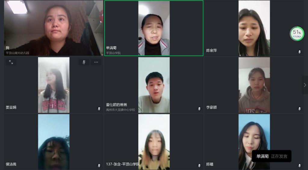单满菊书记首先向大家介绍了目前疫情防控形势下国家、河南省和公司毕业生就业工作的政策和安排以及公司毕业生目前就业情况,并对毕业求职就业过程中应该注意的方面进行了详细讲解。之后,同学们就疫情防控期间求职过程中所遇到的问题如选择合适的岗位、如何防范诈骗等向老师们提问。大家对同学们提出的问题和求职就业中的困惑进行了一一解答,并鼓励同学们积极转变就业观念——先就业再择业,同时也要注重自身综合能力的提升。班会气氛热烈活跃,同学们积极参与互动。随后,两名已就业的员工2016级翻译专业(英语)平佳佳和翻译专业(西班牙语)姜亚娟向大家们分享了她们求职的经历,包括简历制作与投递、线上面试注意事项等,让参会的毕业生有了更加直观充分的了解。