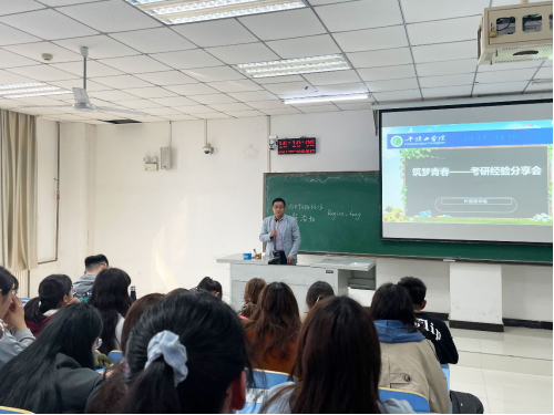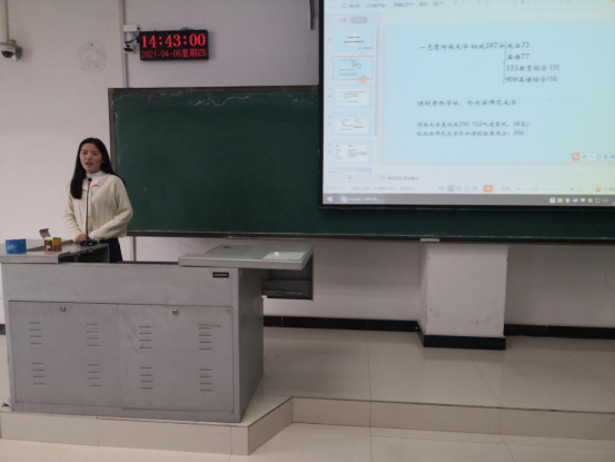 会议伊始,韦士心老师首先向大家介绍了2017级考研情况,对员工所取得的优异成绩表示了祝贺,并鼓励在座的同学向优秀的学长学姐们学习。随后,已参加过复试的同学逐一进行了自我介绍,并结合自己的考研经历,从报考院校、专业选择、备考资料选择和各科复习方法等方面分享了自己的考研经验,为同学们提供了许多宝贵的经验。在谈到报考院校和专业选择时,学姐们提醒同学们切忌跟风,要明确自己的目标,尽快确立考研方向,有目标才有动力。在自由提问环节,同学们提出了自己在报考专业选择、作息时间安排等方面的问题,学长学姐们耐心地给予了解答,并鼓励学弟学妹们树立自信,积极备考。