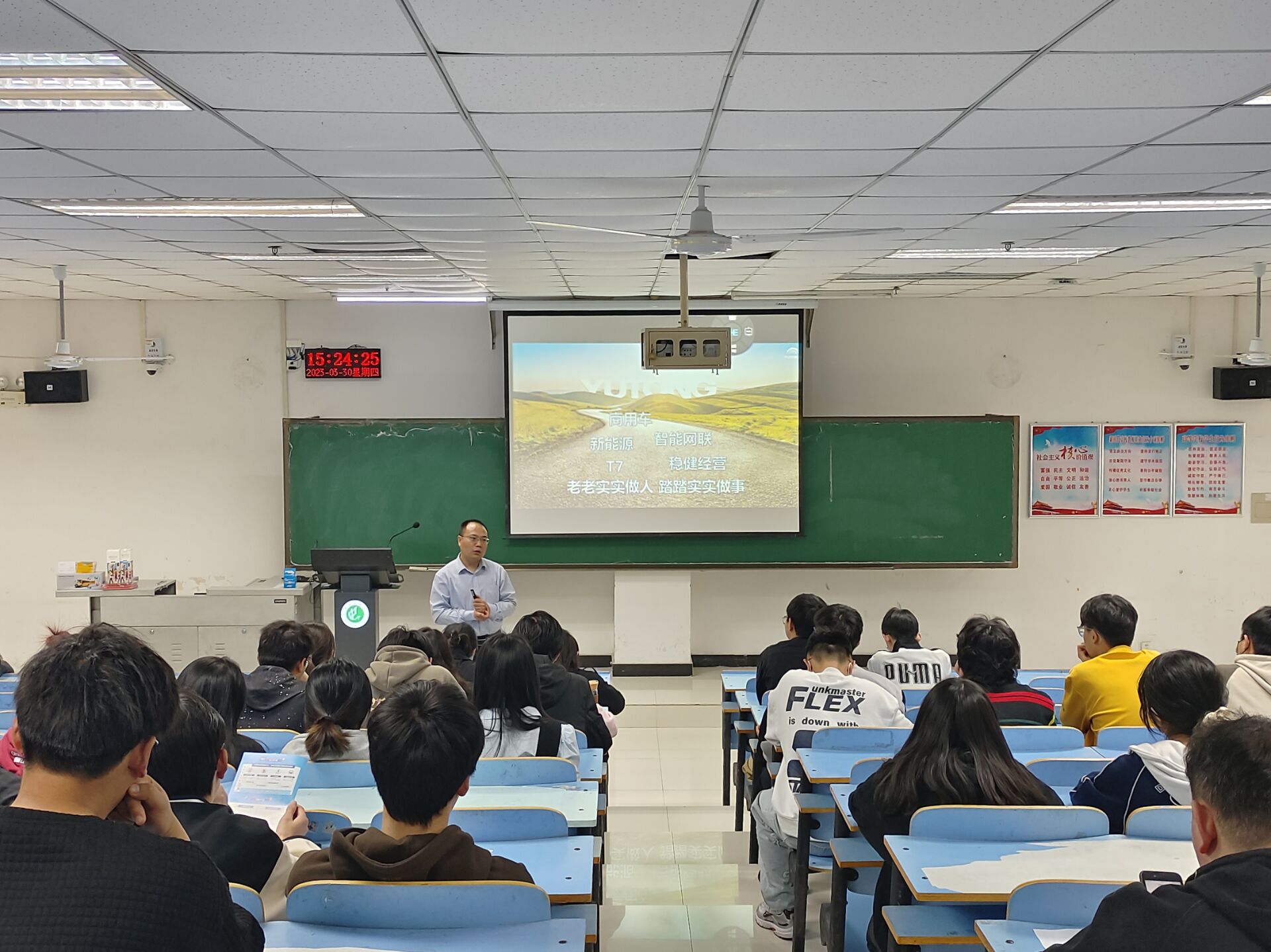 会议伊始,张静向同学们介绍了公司的业务范围、发展概况及公司规模。他讲道,宇通客车是集客车产品研发、制造与销售为一体,产品主要服务于公交、客运、旅游、团体、校车及专用出行等细分市场。企业文化氛围浓厚,强调团队制胜,弘扬创新精神,笃行人性化的管理,包容探索中的失误。能够帮助新人发挥自身才能,快速融入公司环境。接着,他介绍了公司目前需要的是西语方向营销类的管培生及海外销售岗,以及岗位要求。之后,他也针对员工提出的个人发展、薪资待遇、公司福利等问题作出了详细解答。会议最后,张静表示,希望同学们可以认真考虑,积极投递简历,勇于尝试。