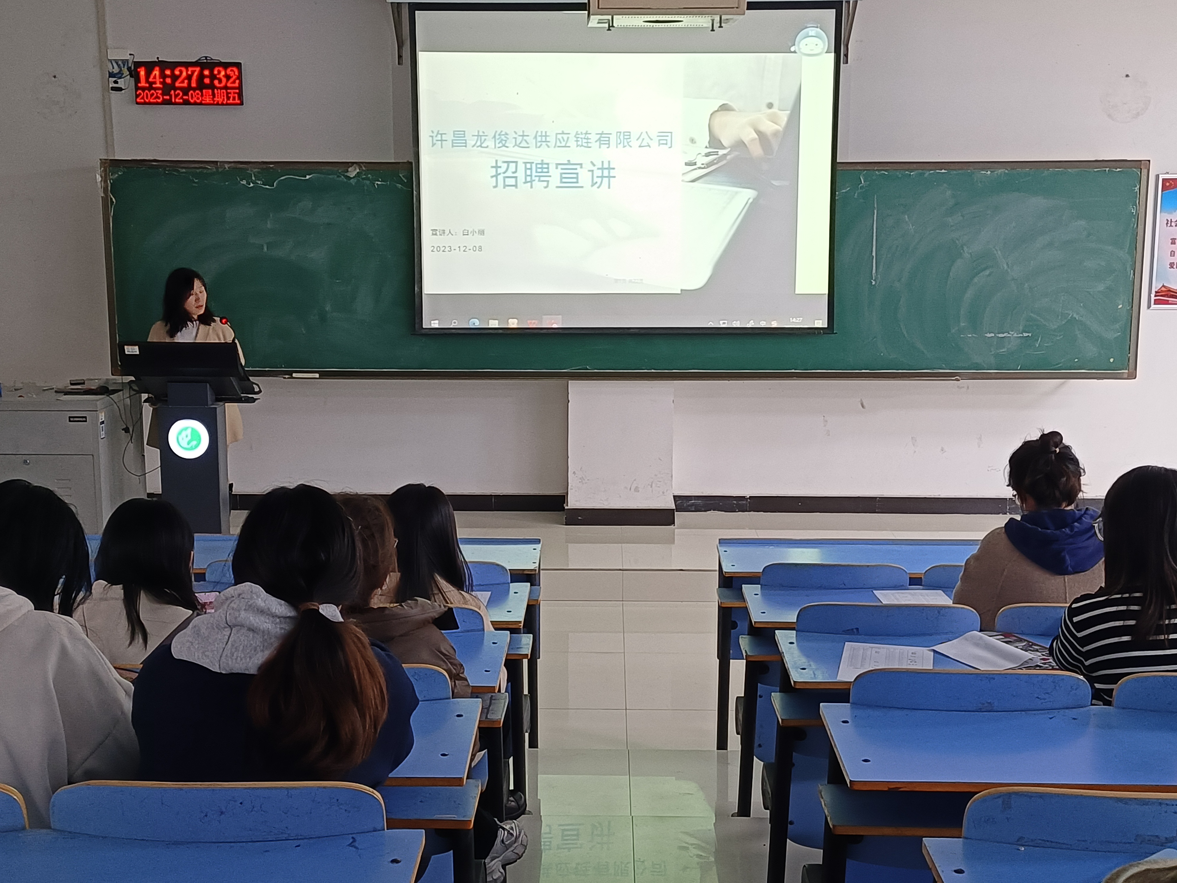 为切实做好毕业生就业工作,拓宽就业渠道,搭建毕业生和用人单位的交流平台,12月8日下午,beats365于图书馆L716召开了许昌龙俊达供应链管理有限公司校园招聘宣讲会。本次宣讲会由许昌龙俊达公司经理白小丽和潘科卫主讲,beats3652020级部分员工参加。