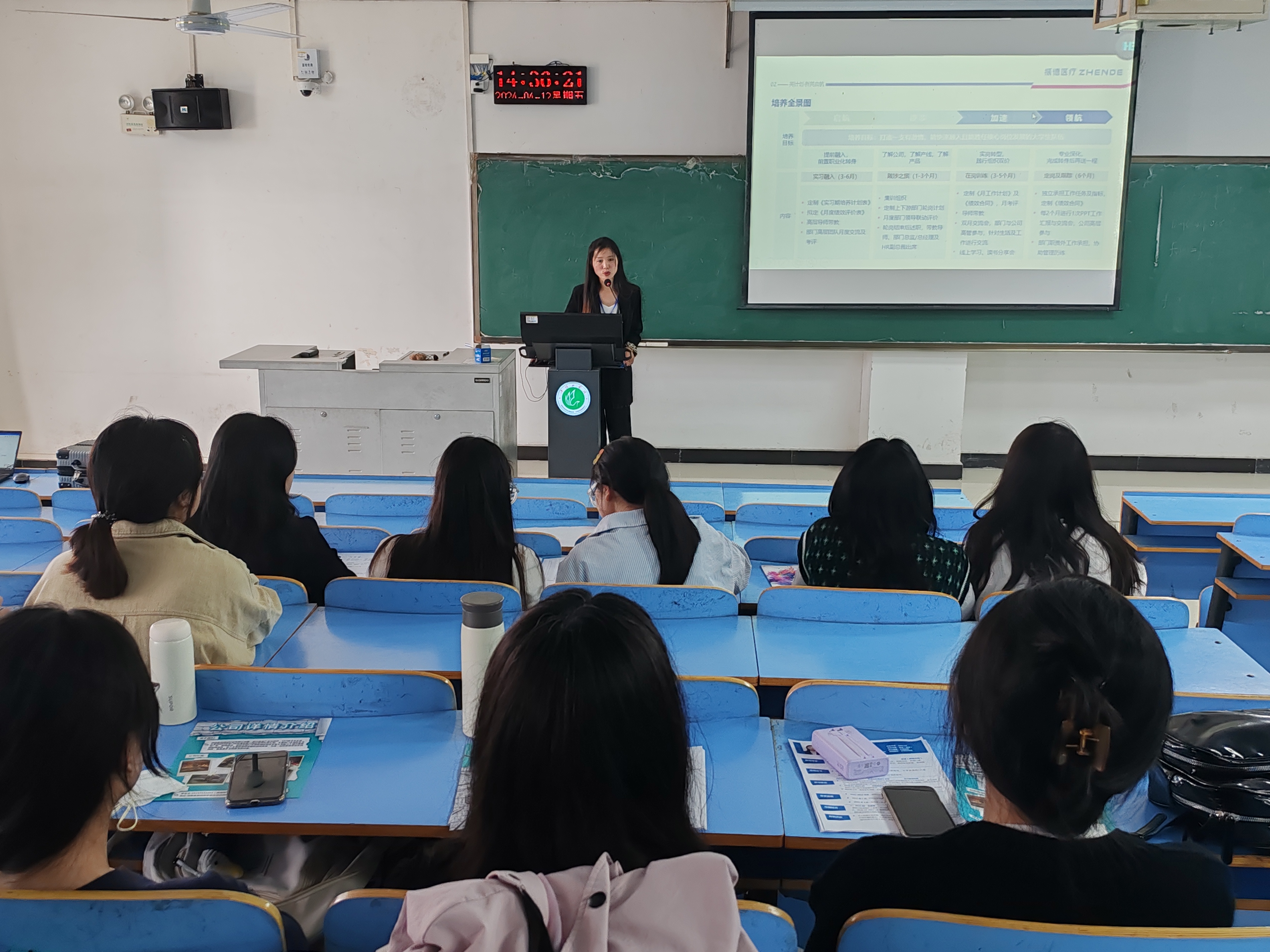 宣讲会伊始,周爱清向同学们详细介绍了许昌振德医疗公司的基本情况,她讲到,公司目前拥有海内外多个生产基地,产品销往全球多个国家,发展前景十分广阔。接着,周爱清从公司的地理位置、运营状况、招聘岗位及福利待遇四个方面展开,向同学们进行了详细讲解。在福利待遇方面,她讲到,振德医疗公司工作环境优良、薪资待遇良好,由于公司海外市场拓展的需要,目前公司对外语人才的需求量大,希望同学们综合考虑各方面因素,根据自身情况积极投递简历。随后,周爱清鼓励同学们积极提出自己的疑问,并细心解答了同学们咨询的问题,帮助同学们完善对公司在招岗位的认识。会后,同学们纷纷表示,在投递简历前,会持续了解该公司的相关需求和发展方向,分析自身的优点与不足,不断提高自身竞争力,并提前规划未来发展,为就业做好充分准备。