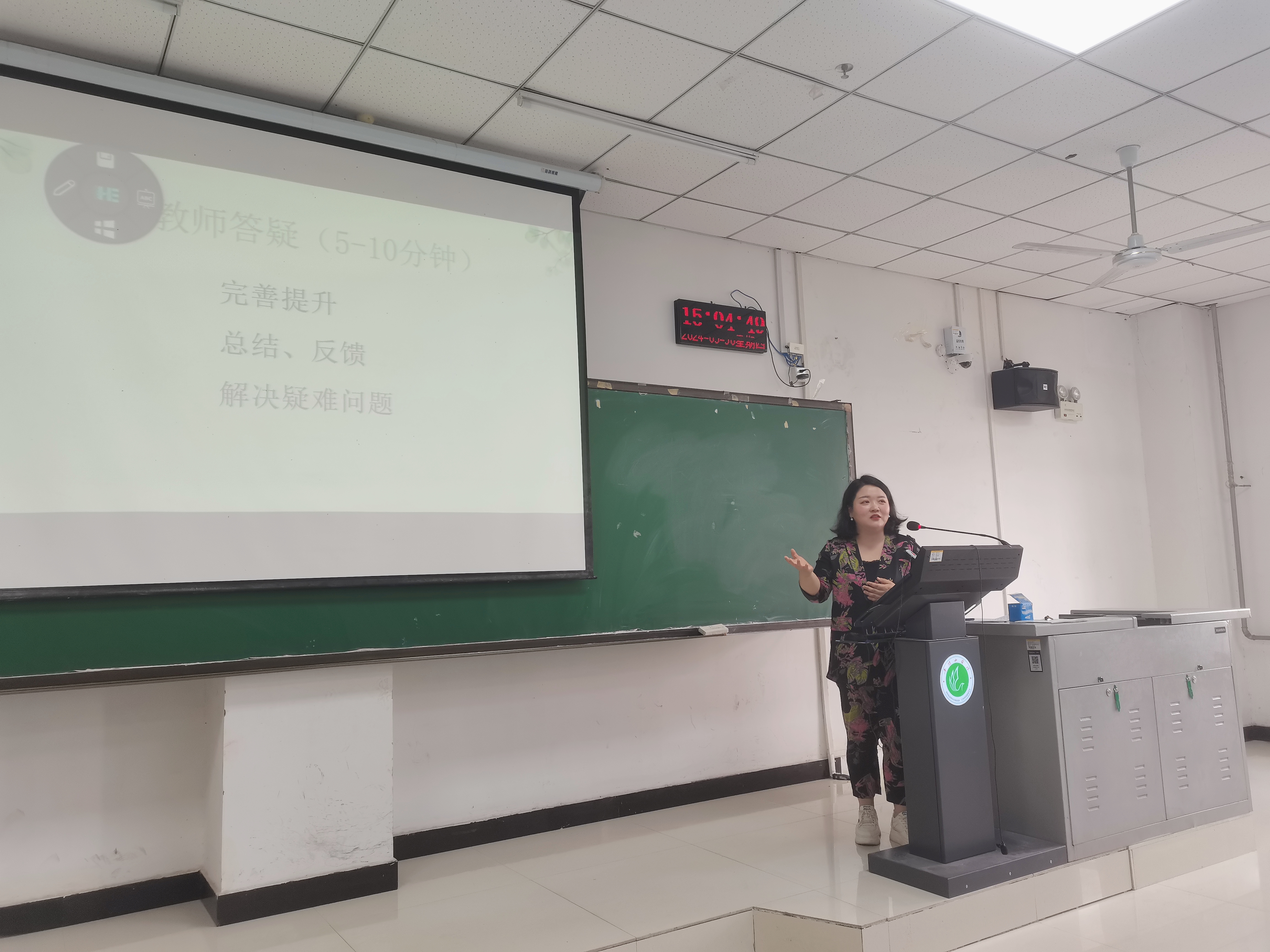 会上,与会教师精神饱满,气氛热烈。薛绯绯老师首先从理论和实践两个方面解读了对分课堂的理念、特点和实施策略,然后介绍了自己过去一年来,如何探索和尝试在大学英语课堂中有效应用对分课堂教学模式,重点围绕教师讲授、员工独学、分组讨论、教师答疑四个环节,细致讲解了教学设计和组织教学中需要注意的问题和解决办法,如怎样在教学设计中适度留白,怎样在对分课堂中精准时间等。